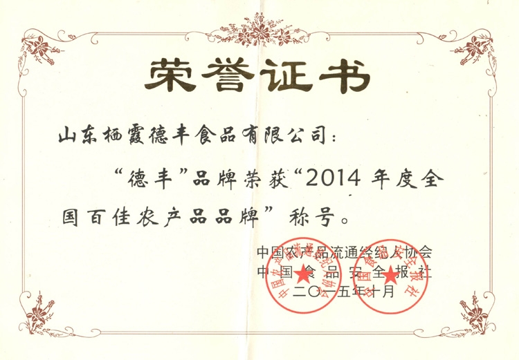 2014年度全國百強農(nóng)產(chǎn)品候選經(jīng)紀人、百佳農(nóng)產(chǎn)品候選品牌經(jīng)過各地農(nóng)產(chǎn)品經(jīng)紀人協(xié)會、供銷合作社,以及共青團組織、婦聯(lián)等部門逐級推薦,評委會辦公室初審,9月12日評委審定會審定等程序產(chǎn)生,在2014年度的百佳農(nóng)產(chǎn)品品牌評選活動中,棲霞德豐食品有限公司榮獲全國百佳農(nóng)產(chǎn)品品牌。